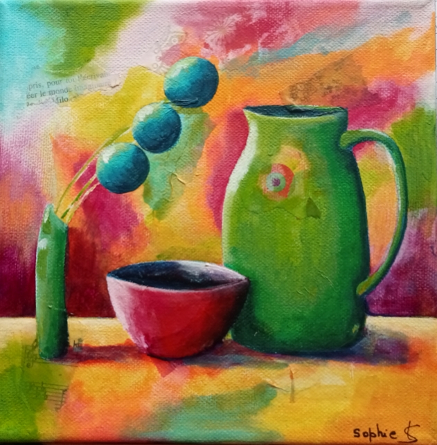 "L'artiste, qui se dit « dilettante », a créé une oeuvre originale et très personnelle à partir d'un travail essentiellement autodidacte. Ce qui frappe au premier regard, c’est l’harmonie générale qui se dégage des toiles de Sophie. Avec une gamme de coloris à la fois doux et acidulés, des formes très dessinées en suspension sur des fonds un peu flous comme froissés. Des petites touches de lumière viennent souligner et sublimer des objets du quotidien qui, dans un autre contexte seraient d’une grande banalité. Sauf que là il suscitent l’intérêt et attirent notre curiosité. L’ensemble est gai, plein de fraîcheur et séduisant. Elle a su également alterner des petits formats et d’autres un peu plus grands offrant ainsi un bel équilibre de l’ensemble. Elle a également ajouté quelques autres toiles très différentes qui, à l’aide de portraits à la touche un peu exotique nous emmènent en voyage dans des régions de soleil."